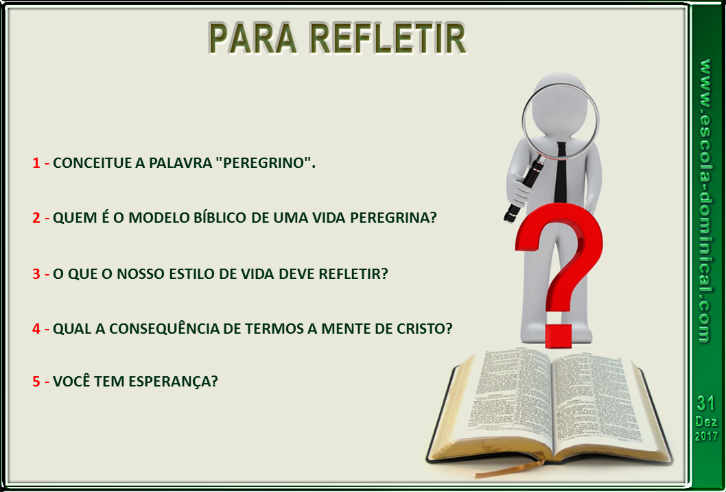 Revista Lições Bíblicas. A OBRA DA SALVAÇÃO, Jesus Cristo é o caminho, a verdade e a vida. Lição 14 – Vivendo com a mente de Cristo. I – Peregrinos nesta terra. 1. Peregrinos na terra. 2. Cidadãos celestiais. II – Vivendo em esperança com a mente de Cristo. 1. Passando pelas provações com a mente de Cristo. 2. Um olhar para além das circunstâncias. Editora CPAD. Rio de Janeiro – RJ. 4° Trimestre de 2017.