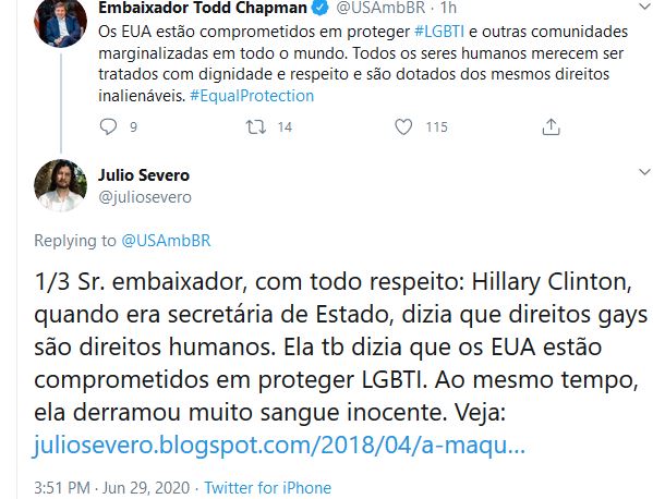 “Sr. embaixador, com todo respeito: Hillary Clinton, quando era secretária de Estado, dizia que direitos gays são direitos humanos. Ela tb dizia que os EUA estão comprometidos em proteger LGBTI. Ao mesmo tempo, ela derramou muito sangue inocente. Veja: http://juliosevero.blogspot.com/2018/04/a-maquina-de-guerra-e-destruicao-de.html”